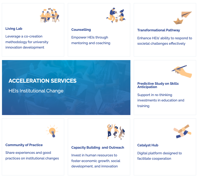 Support universities in embedding transformation into their strategy, governance and operations through a structured process and targeted acceleration services. In particular, it helps to: